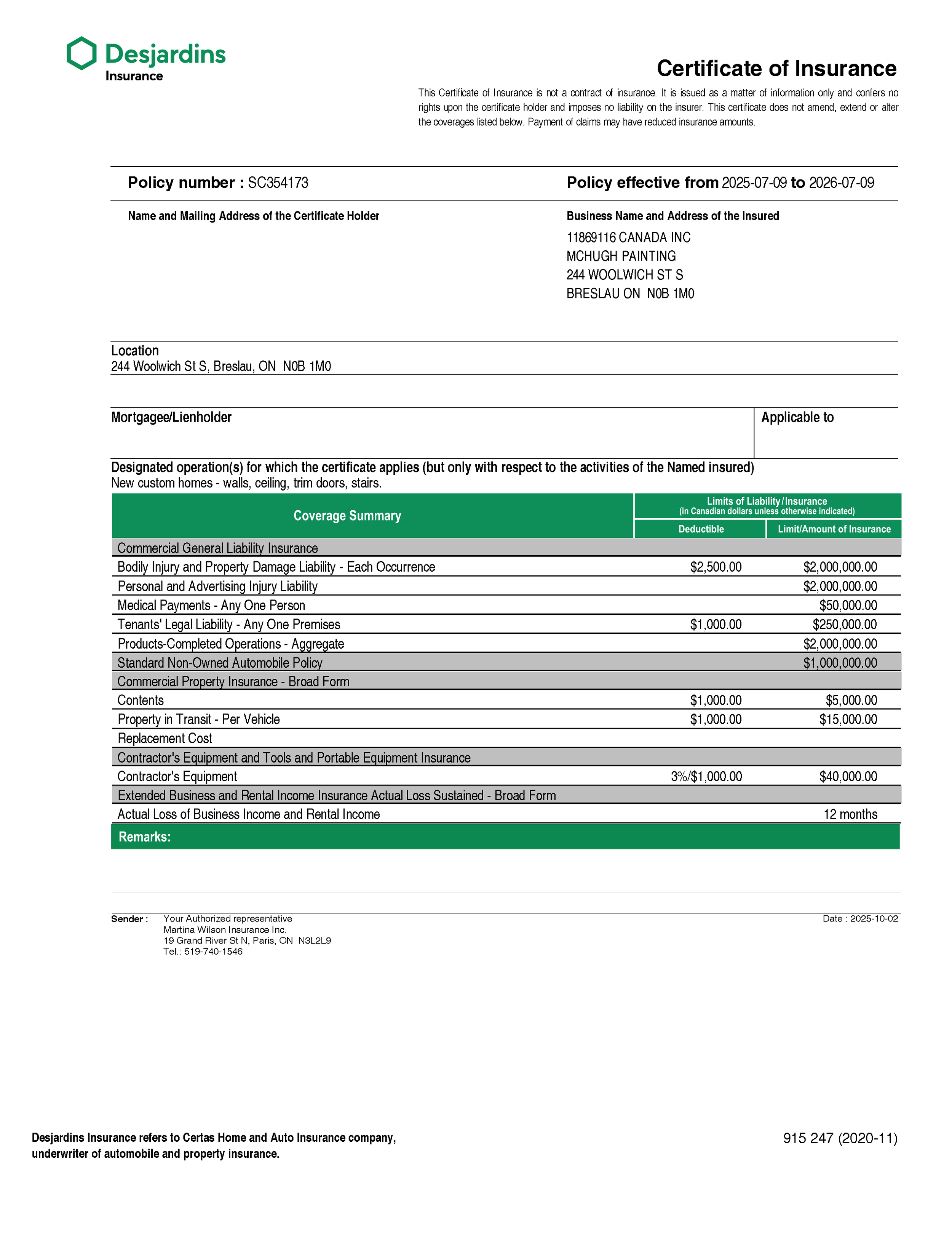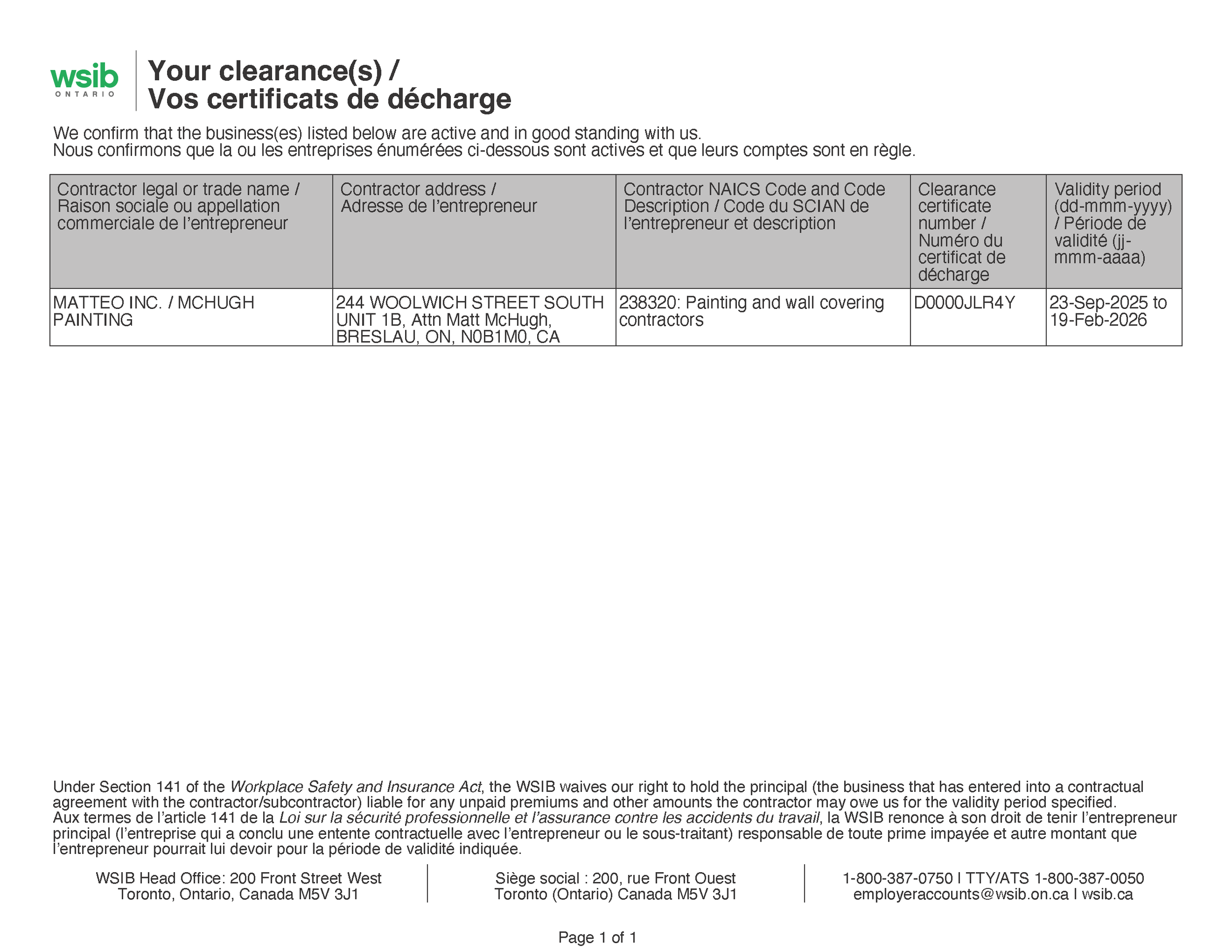 McHugh Painting is fully insured and WSIB compliant for your peace of mind. We carry comprehensive liability insurance and maintain active WSIB coverage to protect our clients, properties, and team members on every project.